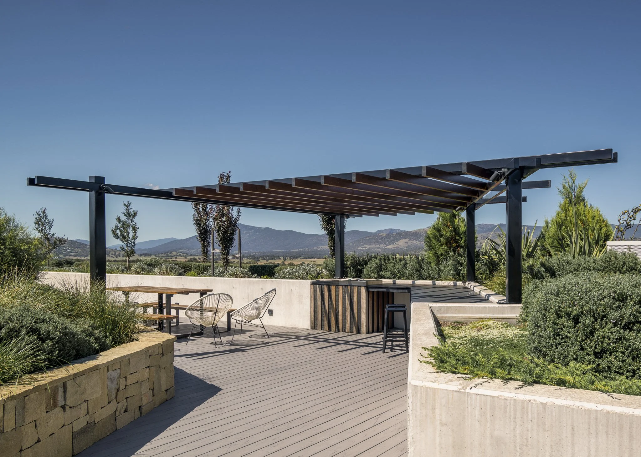 Central to the design is a rooftop garden that features open lawn areas, fire pits, BBQ areas, and a pool, offering residents a luxurious outdoor space with stunning views of the Brindabellas.
